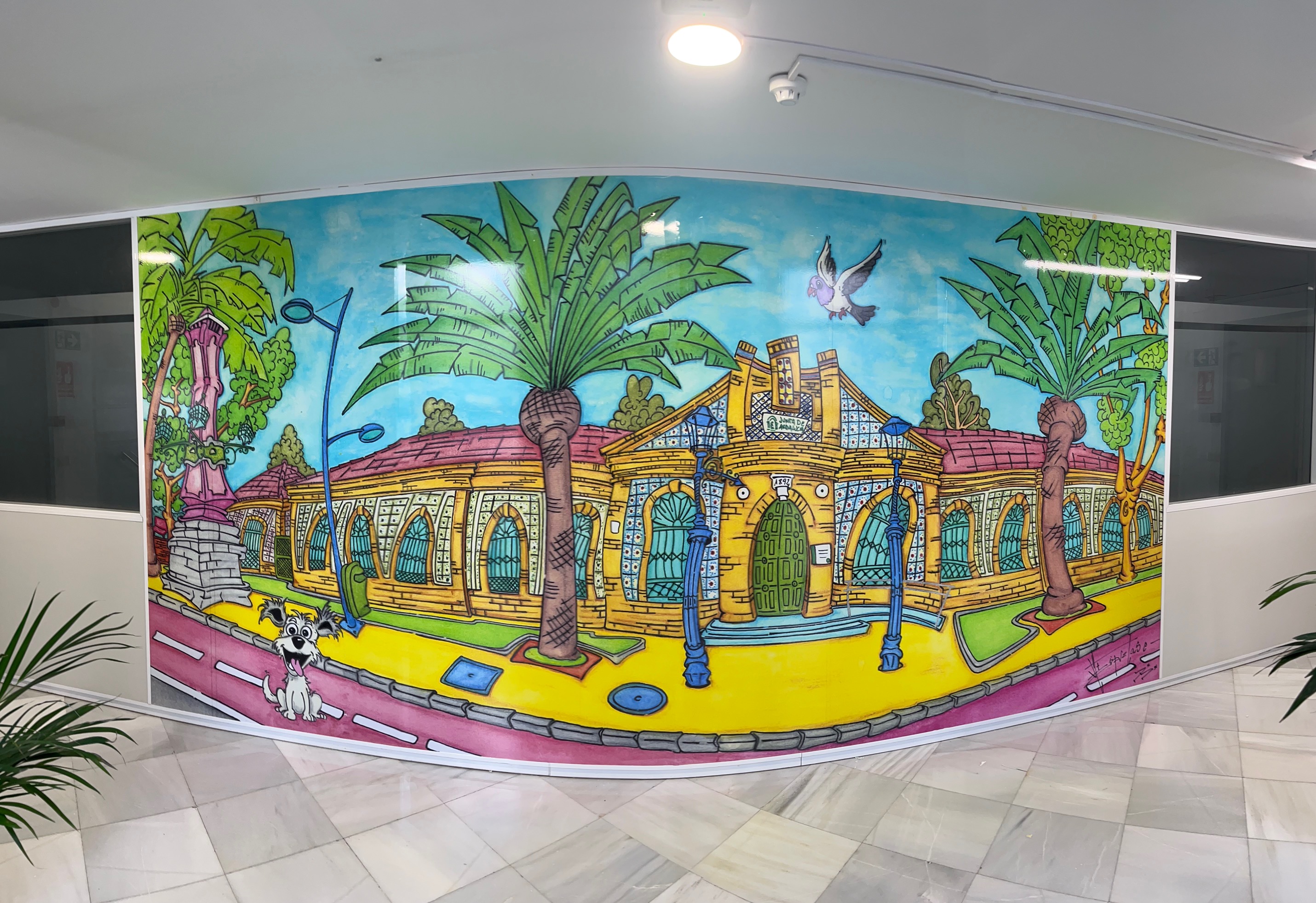 Se trata de una ampliación de la obra que entregué hace unos días, en la que se representan las antiguas oficinas de la Estación de Zafra. La imagen les encantó desde el primer momento y quisieron plasmarla a gran escala en la entrada de la delegación, para dar un aire más alegre y acogedor a ese espacio.