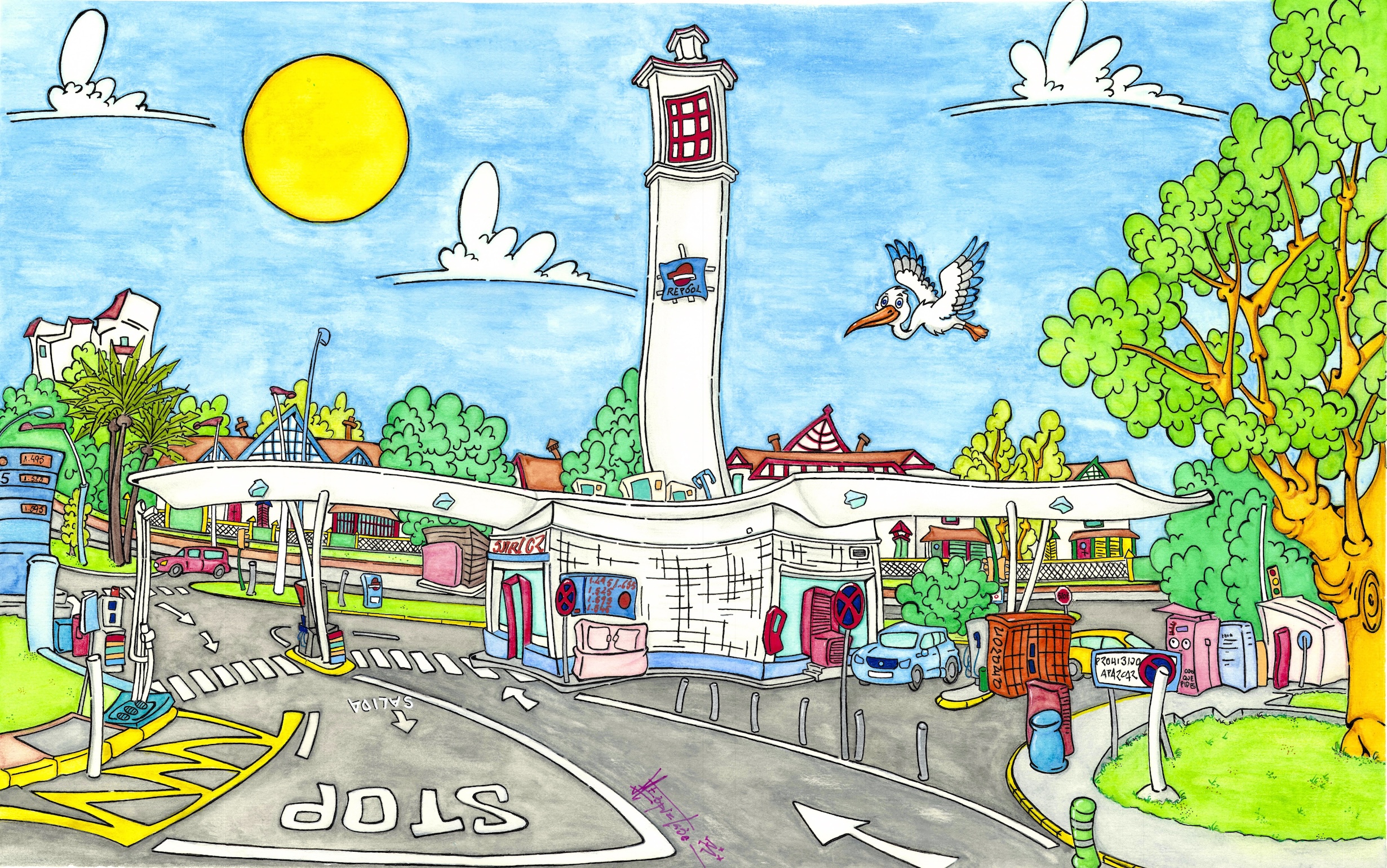 El dibujo representa la gasolinera de la compañía CAMPSA que es una de las obras más importantes de la arquitectura onubense. Fue diseñada en 1955 y constituye un claro ejemplo de la arquitectura moderna en nuestra ciudad.