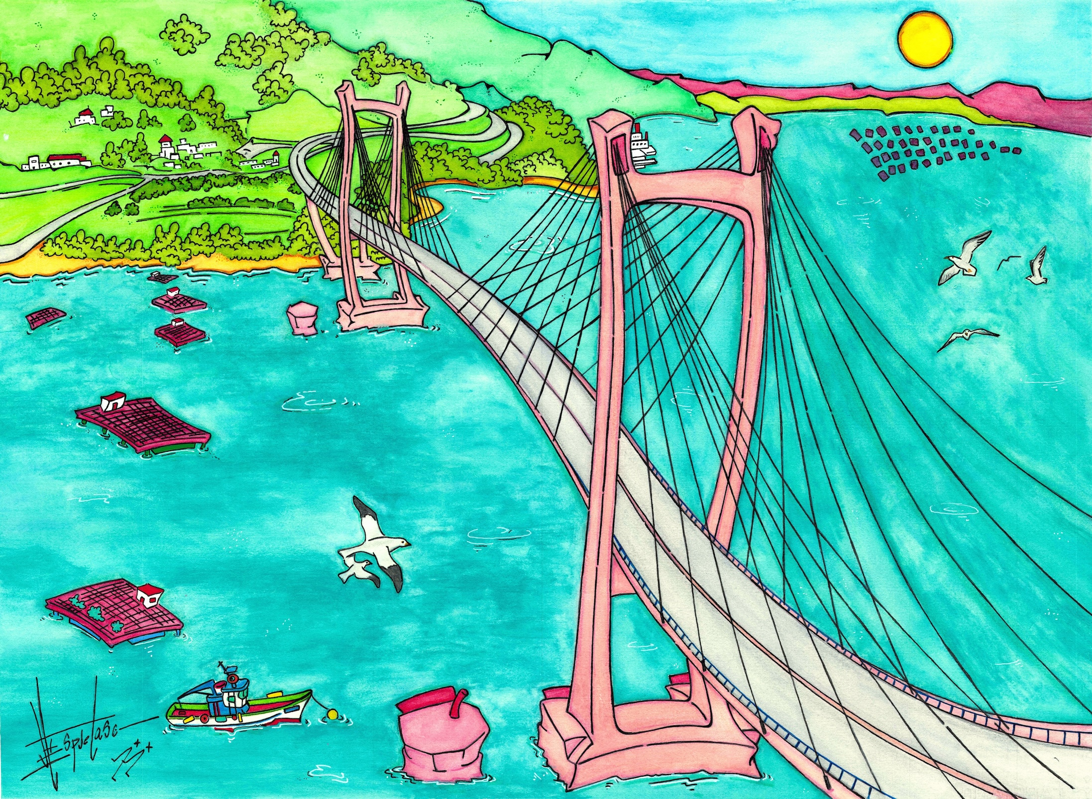 Sobre las aguas de la ría se han representado las tradicionales bateas de mejillones, tan características de esta zona, junto a un pequeño barco pesquero que refuerza el carácter marinero del paisaje. Varias gaviotas surcan el cielo, aportando dinamismo y vida a la escena.